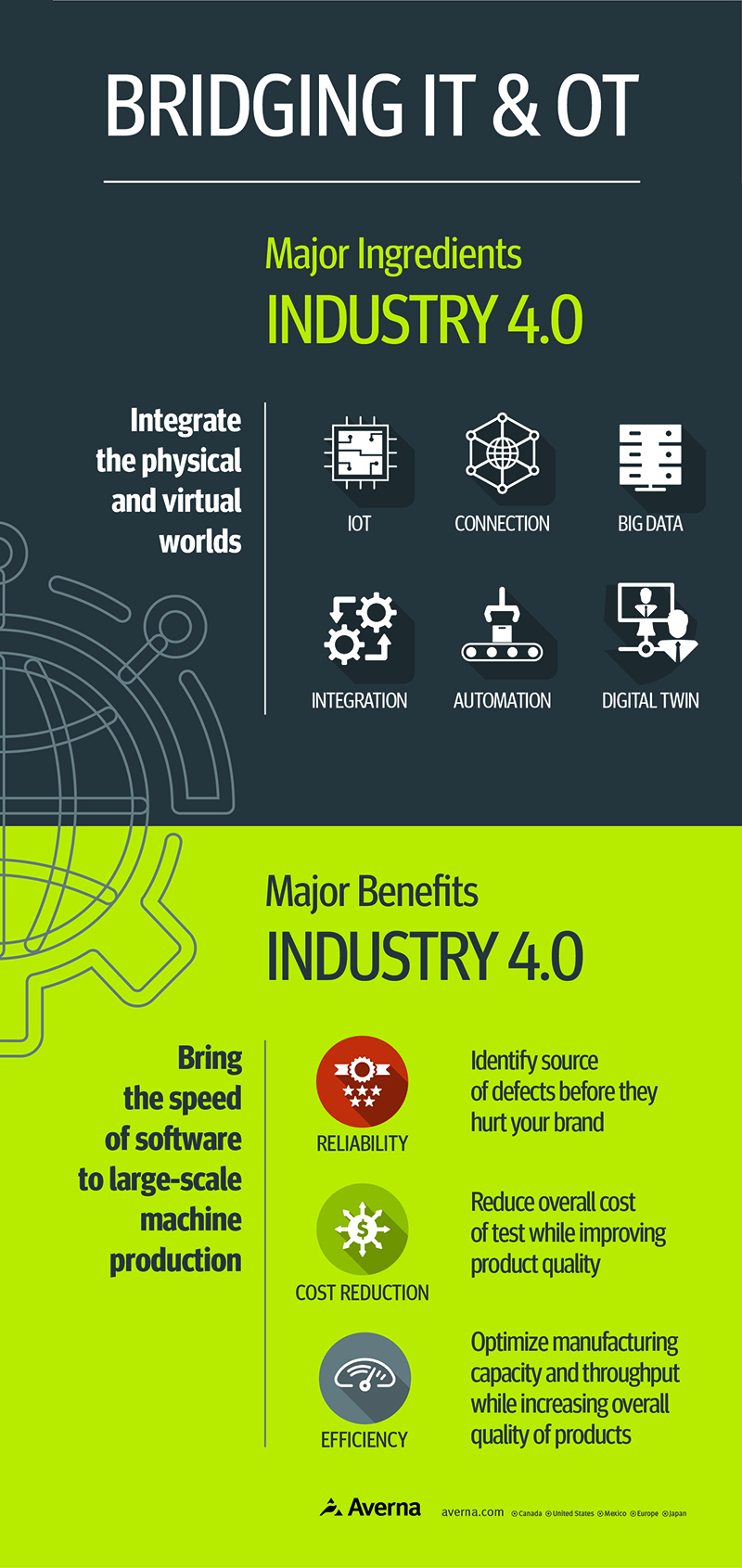 The Fourth Industrial Revolution (Industry 4.0) is closing the gap between information technology (IT) and operational technology (OT). This latest revolution in multifaceted, consisting of factors like IoT, test automation, and digital twins, all of which are necessary components in integrating the physical and virtual worlds. This merging of traditional manufacturing and current technology has meant rapid changes for the industry, forcing manufactures to adapt quickly or fall behind. But while the challenges may be great, the numerous benefits, including increased test reliability and efficiency, reduced tests costs, and improved product quality, cannot be denied. Are you ready for Industry 4.0?